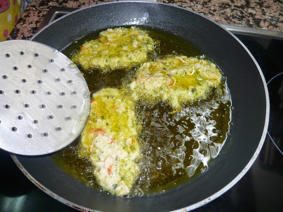 Pasado el tiempo, ponemos aceite en una sartén, unos tres dedos. Cuando esté bien caliente, vamos echando cucharadas de la mezcla y vamos friendo nuestras tortillitas.