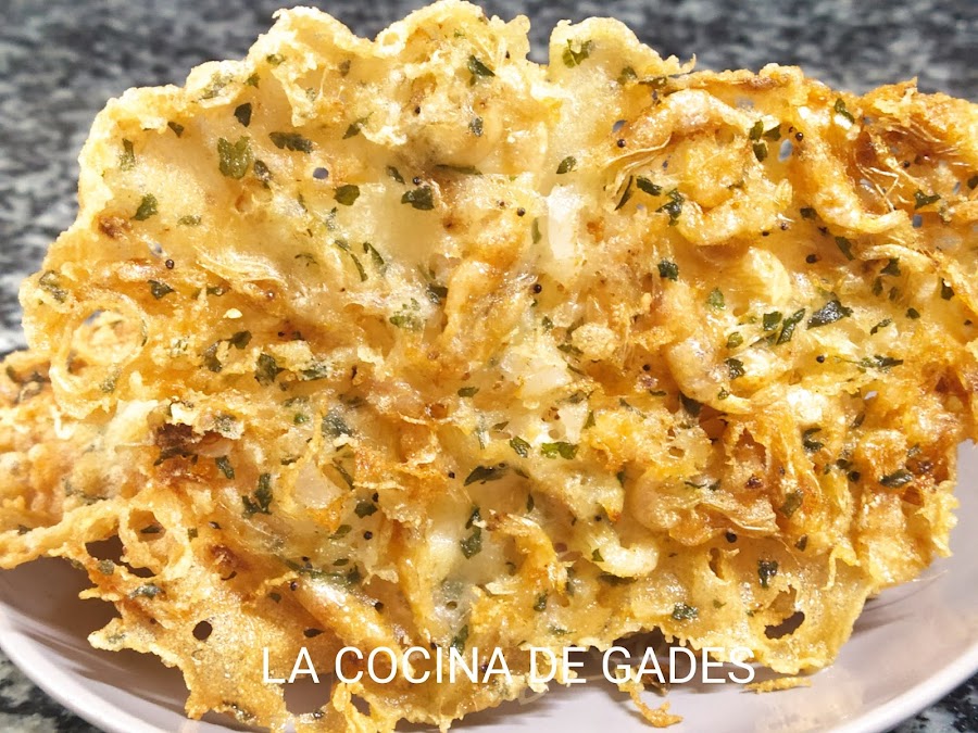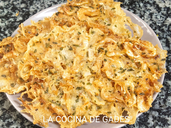 Aove.En un bol añadimos la cebolla, el perejil, las harinas, la sal y el agua mezclamos todo,por último los camarones y mezclamos otra vez, nos quedará una masa muy líquida.
