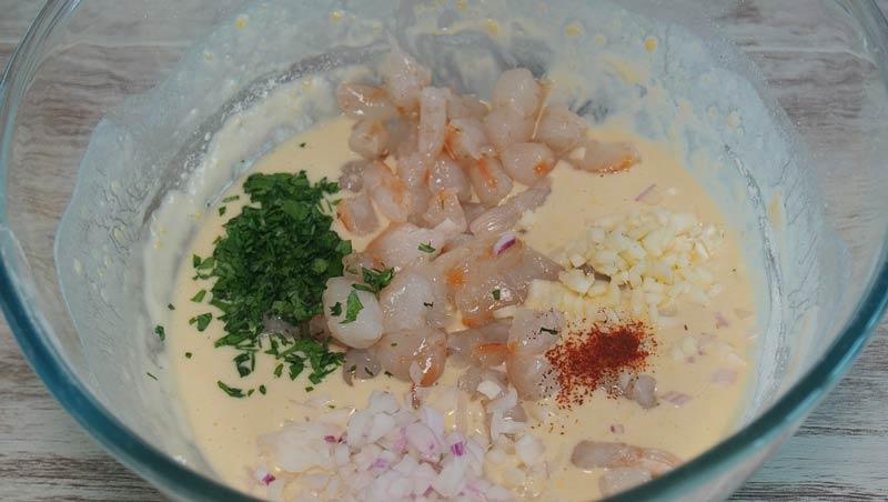 Ahora, agregamos las gambas troceadas a la masa que habíamos preparado con la cerveza. Añadimos también la cebolla muy picada. Un diente de ajo pelado y bien troceado. Unas hojitas de perejil fresco picado. Y una pizca de azafrán.