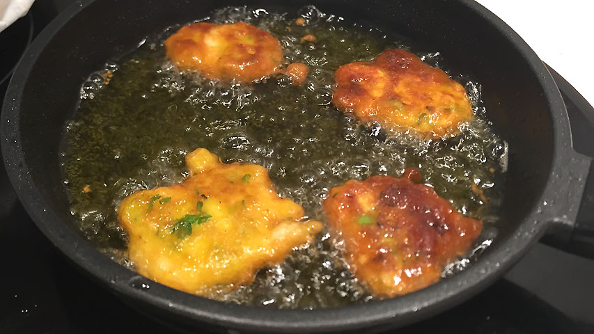 Fríe las tortillitas dejando caer cucharadas colmadas de la mezcla del bol en el aceite. Puedes freír unas 4 cucharadas a la vez en una sartén de 20 cm de diámetro.
