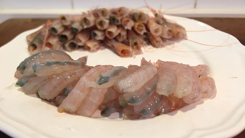 Pela las gambas. Para esta receta solo usaremos las colas. Las cabezas las congelaré para usarlas en otra ocasión para hacer caldo por ejemplo.