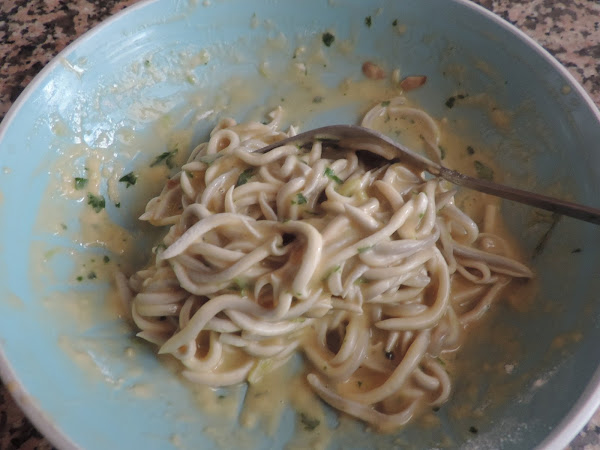 Picamos el ajo y el perejil, después batimos un huevo, y le añadimos el picado de ajo y perejil, la cucharada de harina, y un poco de sal, lo batimos todo bien que no queden grumos, después le añadimos las angulas sucedáneas bien escurridas y se forma una pasta de angulas sucedáneas.
