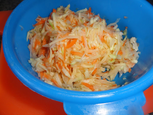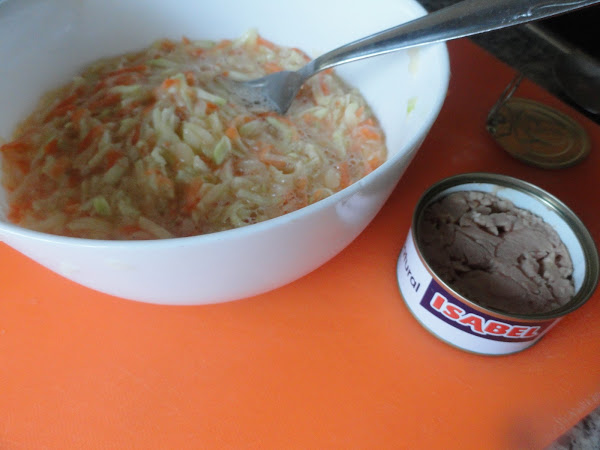 Con un rallador rallamos toda la verdura en tiritas finitas. Dejamos un buen rato en un colador para que suelte agua. Escurrimos bien y ponemos en un bol con los huevos batidos, sal y pimienta y el atún. Y vamos dorando por los dos lados con poquito aceite.