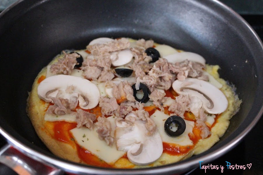 Añadimos los champiñones, aceitunas en rodajas y el atún. Tapamos con una tapadera y dejamos que se cocine a fuego bajo. Hasta que el queso se funda un poco.