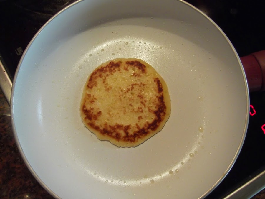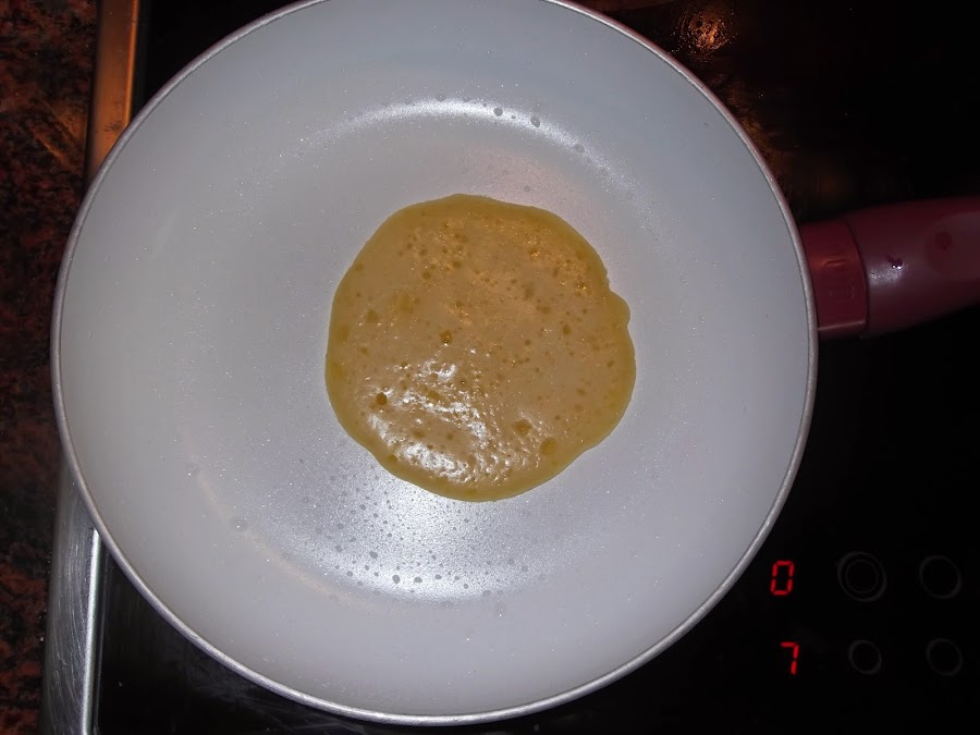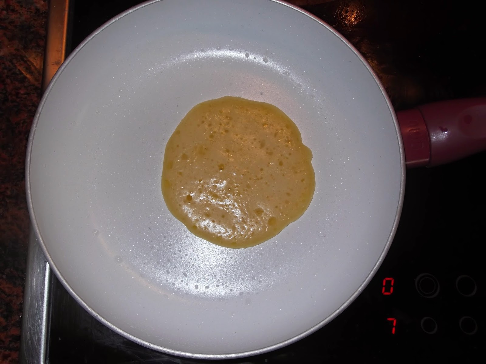 Mientras tanto en una sartén que no se pegue echamos un poco de aceite de girasol o de mantequilla y la ponemos a fuego medio. Cogemos un cazo con un poco de masa y la echamos en la sartén, cuando veamos que comienzan a salir burbujitas en la tortita, le damos la vuelta con una espátula, con un tenedor o con una cuchara, con lo que más sencillo os parezca. La tenéis durante un par de minutos y le volvéis a dar la vuelta para ver si la tortita está bien cocinada.