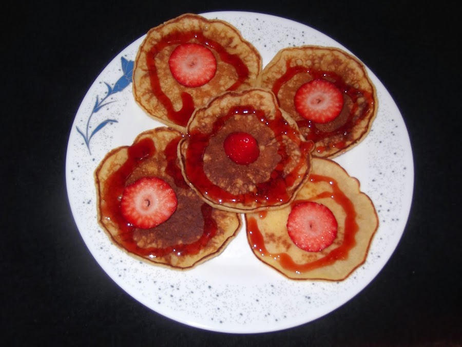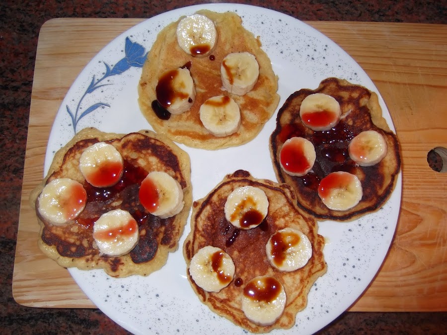 Cuando ya esté en el punto deseado se saca a un plato y echamos otro cazo de masa en la sartén para ir cocinando el resto de las tortitas, vais formando una pequeña montaña con todas ellas para que no se enfríen. Luego las repartís en diferentes platos y le ponéis los ingredientes que más os gusten, para no aumentar mucho el aporte calórico, yo me decante por fresas con sirope de fresas y plátano con caramelo. Con las medidas que os he dado salen unas 8 tortitas.