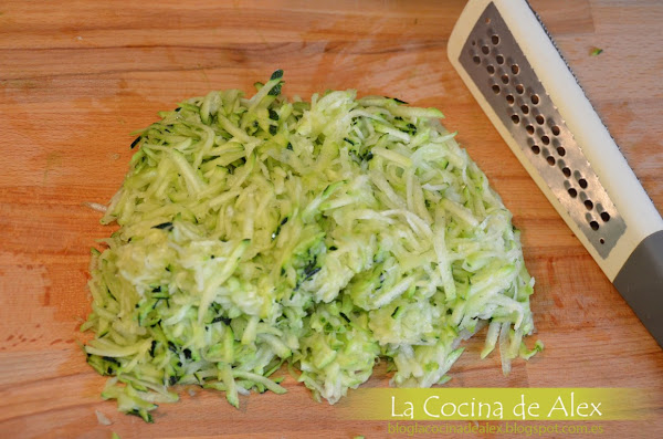 Para hacer las tortitas de calabacín. Lo primero que tenemos que hacer es lavar muy bien el calabacín pelarlo dejado un poco de piel (si quereis podeis dejarla toda) y rallarlo. Con la ayuda de un colador vamos a apretar para intentar eliminar todo el agua posible, incluso podemos apretar entre dos manos.