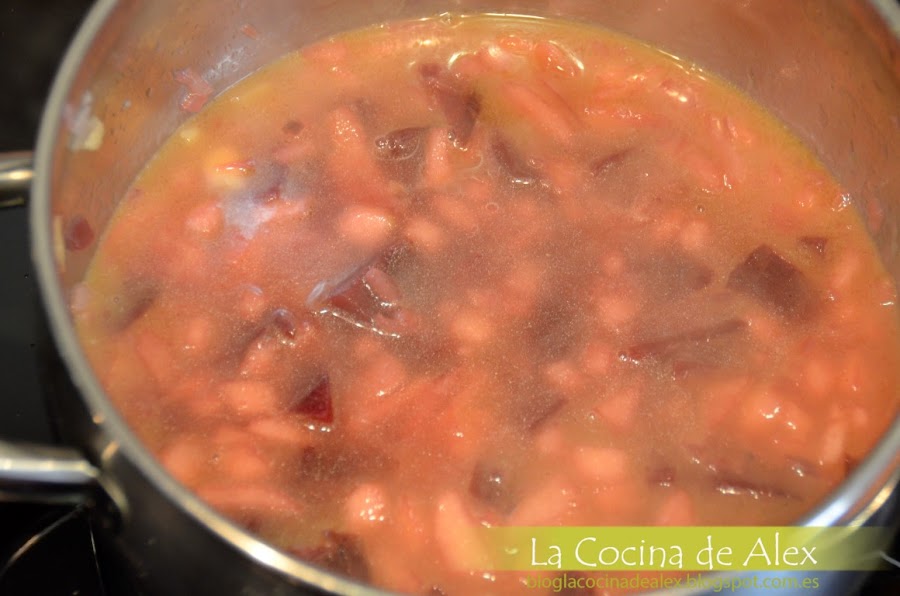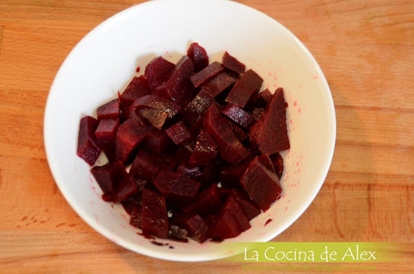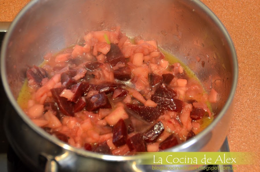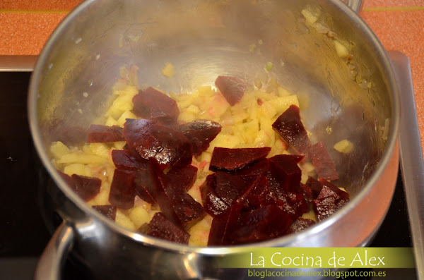A continuacion incorporamos la remolacha troceada y cocinamos unos minutos.