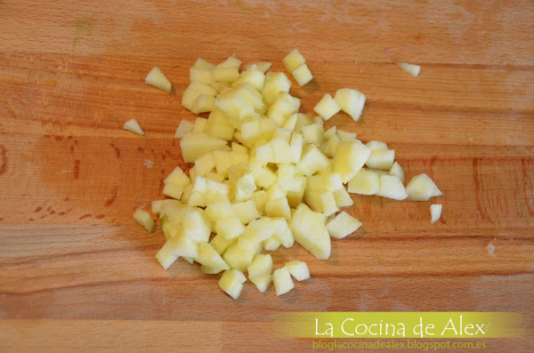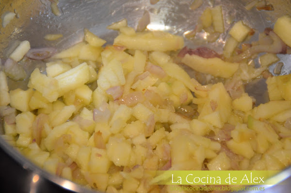 Cuando esté pochada agregamos la manzana troceada y seguimos cocinando todo junto hasta que la manzana esté blanda.