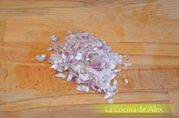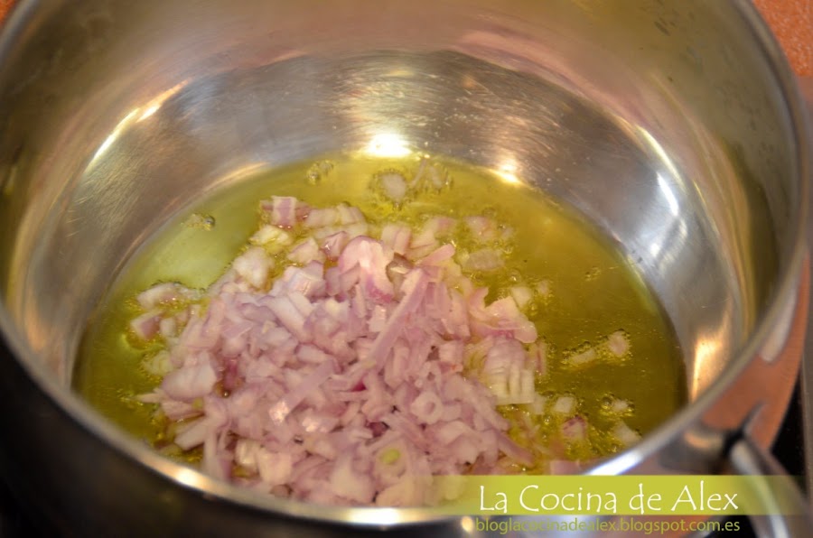 PREPARACIÓN:En primer lugar vamos a hacer la salsa de remolacha, picamos la chalota o cebolla y la ponemos a pochar en un cazo con un poco de aceite de oliva.