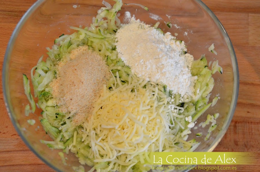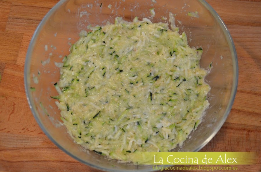 En un bol batimos el huevo y agregamos el calabacín rallado y escurrido, sal, pimienta molida, maicena y levadura. Mezclando todo junto con la ayuda de un tenedor.