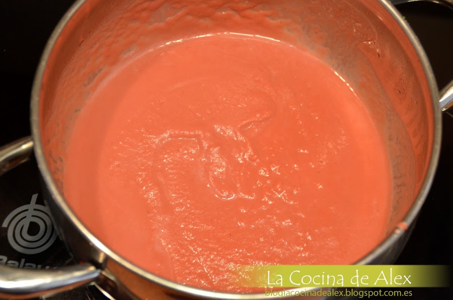Por último solo tenemos que triturar, colar por un colador o chino, rectificamos de sal y pimienta. Si es necesario espesar ponemos a hervir y agregamos maicena disuelta en agua fría hasta la textura que más nos guste, en mi caso no fue necesario. Reservamos la salsa.