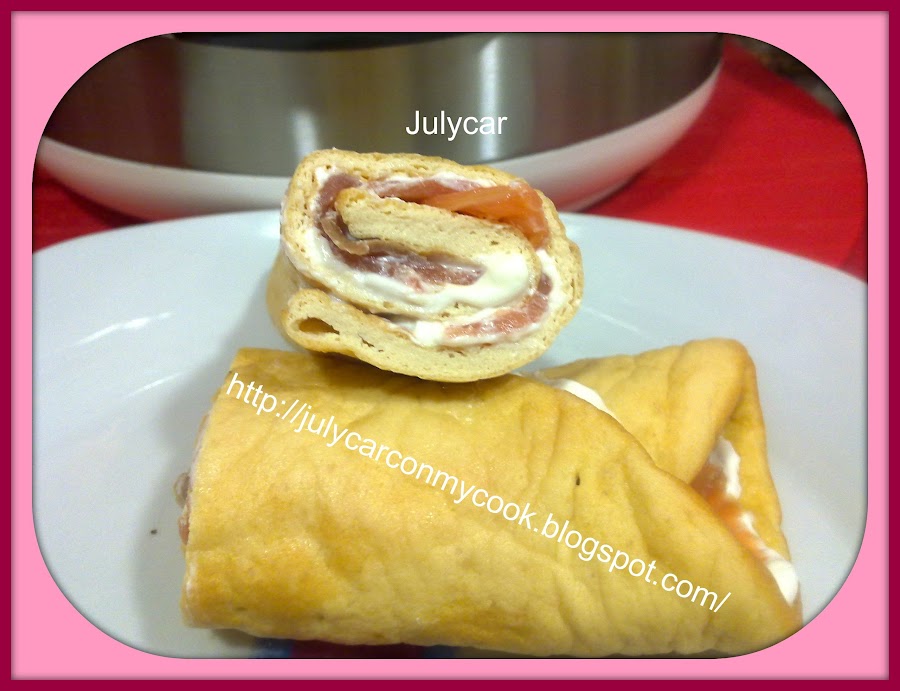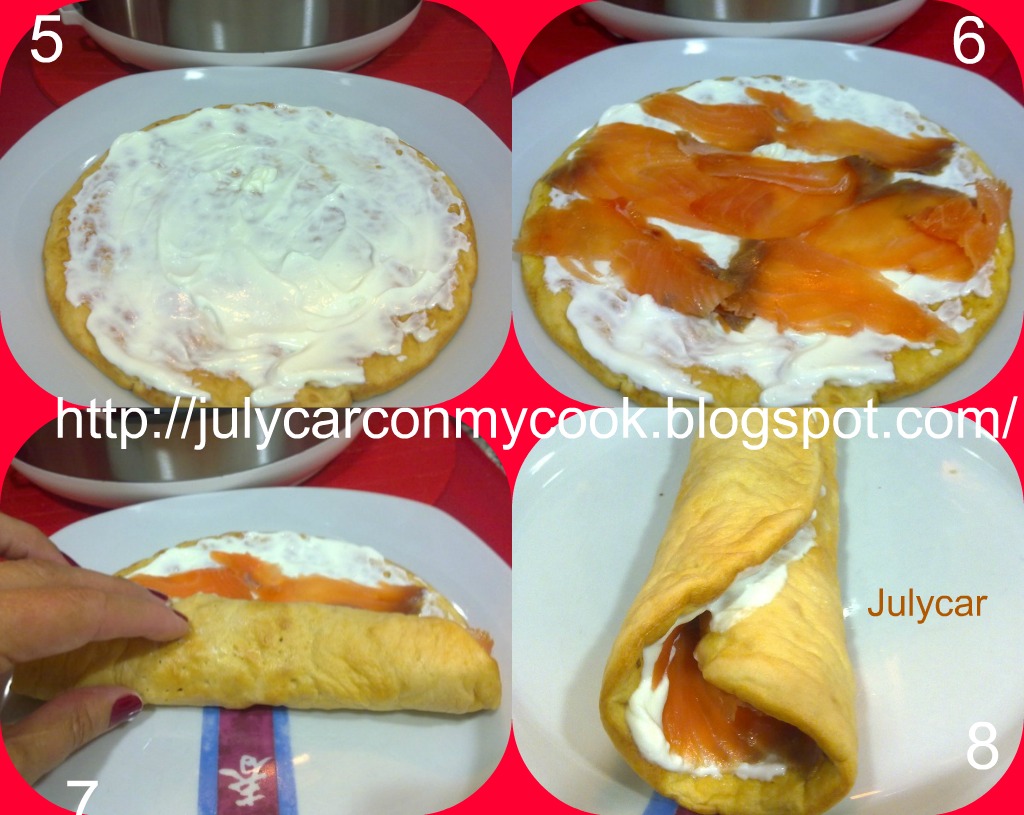 Poner en el vaso de la batidora todos los ingredientes de la tortita y batir bien con la batidora, una vez batido hechar la mezcla en la cubeta de la Cocimix DeLuxe y poner la tapa doradora, programar la tapa a 250º 10 minutos, la olla menú horno 140º, 10 minutos, cuando termine sacar y dejar enfriar, cuando este fria untar con el queso quark, encima poner el salmón y enrollar, lista para comer