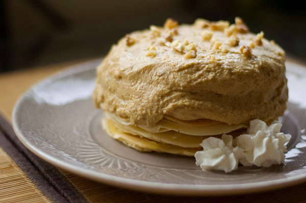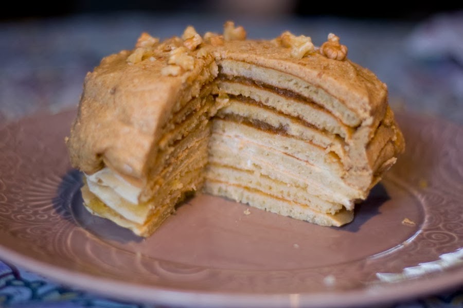 El montaje de la tarta no tiene mucha complicación. Me salieron 8 tortitas (7 espacios a rellenar), los dos centrales los rellené con la nata (crema de leche) y el resto con la compota de manzana, pero puedes alterar el orden y la proporción de los rellenos si te apetece. Lo único procura nivelar bien los rellenos y cuadrar las tortitas para que no parezca la torre inclinada de Pisa (la mía, de hecho, lo parece un poco xD).