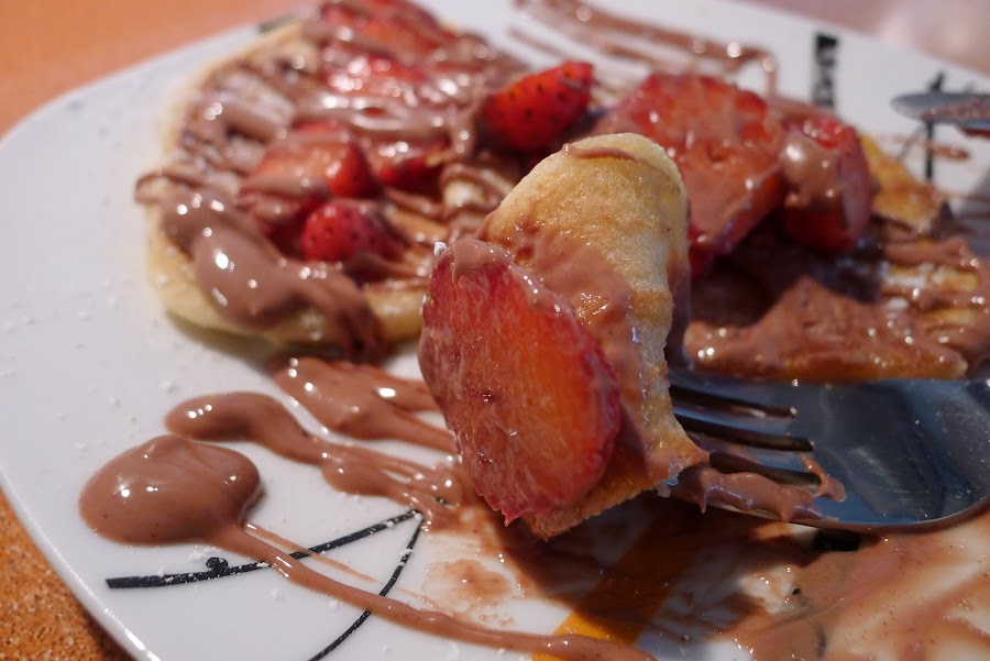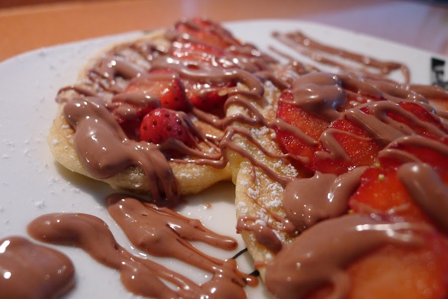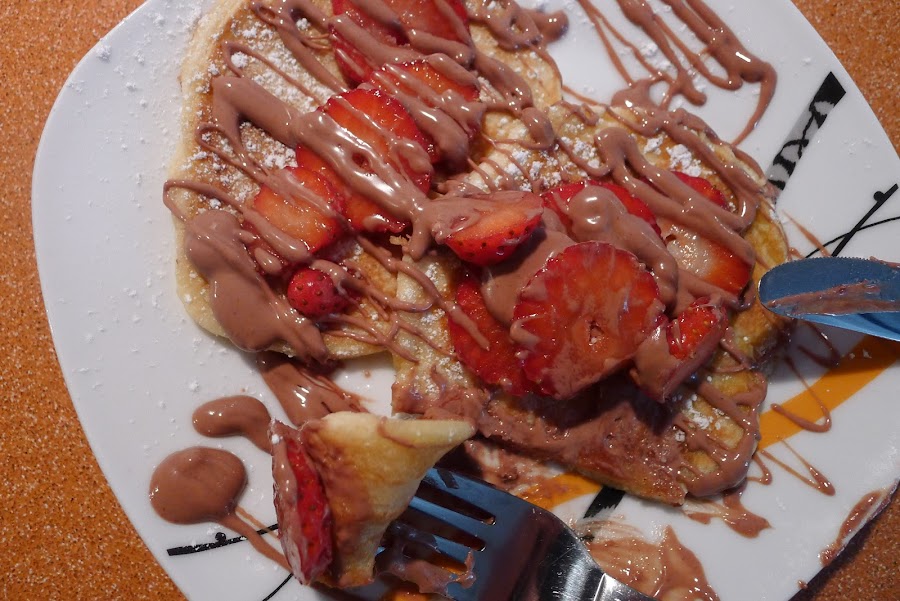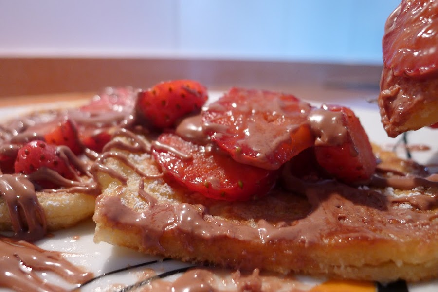 Teniendo ya la mezcla de las tortitas preparadas,procedemos a hacerlas,echando una pequeña cantidad en una sarten pequeña y dejando dorar.Damos la vuelta para que se hagan tambien por el otro lado,asi con todas.Servimos acompañadas con lo que mas nos guste,en este caso con el chocolate con leche y canela (o el que prefirais) previamente fundido al micro ,unas fresas cortaditas a laminas y un poco de azucar glass espolvoreado.