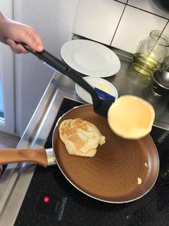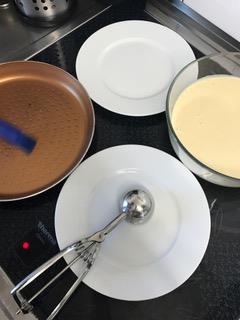 Paso 2: con la masa lista en un bol, disponemos al fuego medio fuerte, una sartén en la que nos quepan 2 tortitas, teniendo como medida una cazo de bolas de helado pequeño.