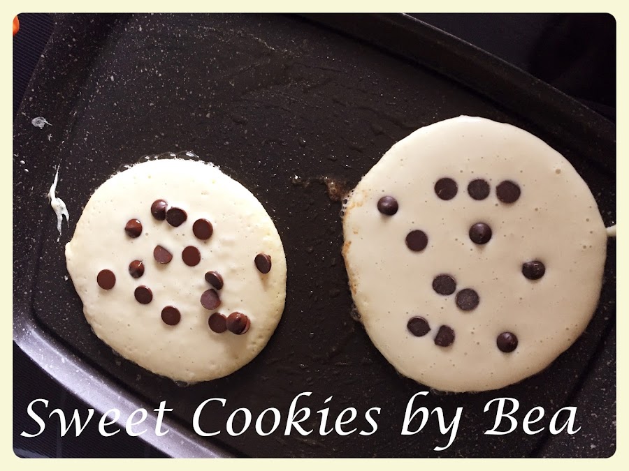En una sartén o plancha antiadherente pincelamos un poco de mantequilla y ponemos un poco de masa con unos chips, si ya sé, mucho chocolate, pero es que son unas tortitas de día especial. Les damos la vuelta cuando veamos que la parte de abajo esta dorándose.