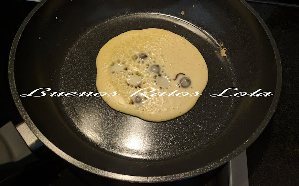 Pon todos los ingredientes en un vaso de batidora salvo las perlas de chocolate. Tritura bien; añade las perlas mezcla con una cuchara. Pon a calentar una sartén antiadherente y unta muy ligeramente con unas gotas de aceite de oliva virgen extra (no pongas el fuego demasiado fuerte)