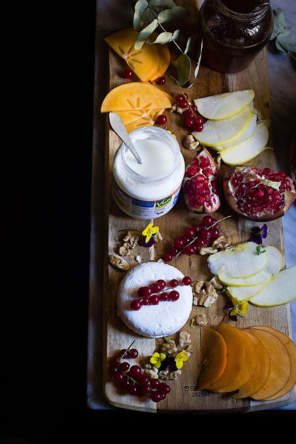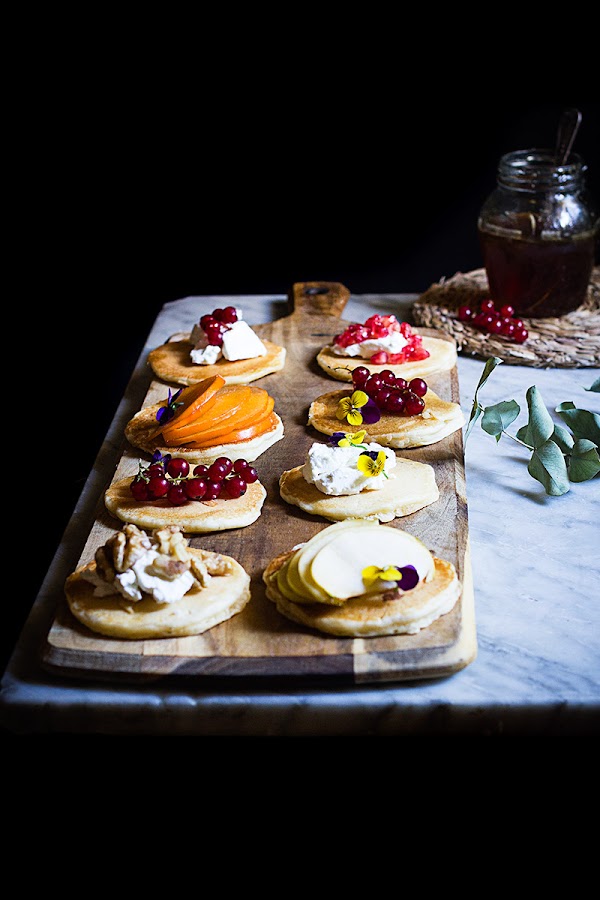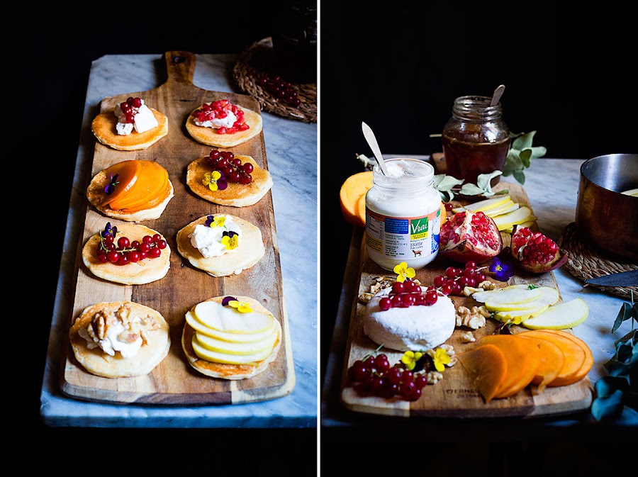Estas tortitas admiten cualquier acompañamiento, en éste caso al tratarse de un desayuno saludable, las hemos disfrutado con queso de cabra fresco de cabra, nueces, miel, caquis, manzana, etc.