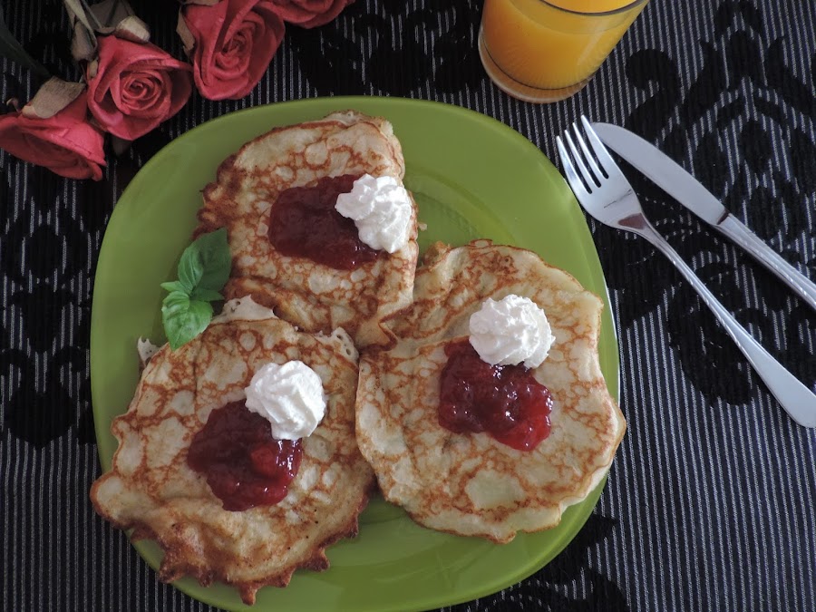 La verdad, es que yo no soy muy cinéfila, y no se me ocurría gran cosa que hacer. Esta receta que he hecho fue la primera que se me vino a la mente, porque en casi todas las películas de amor, después de una noche mágica, siempre hay un desayuno de tortitas con nata (crema de leche) servido con zumo de naranja....