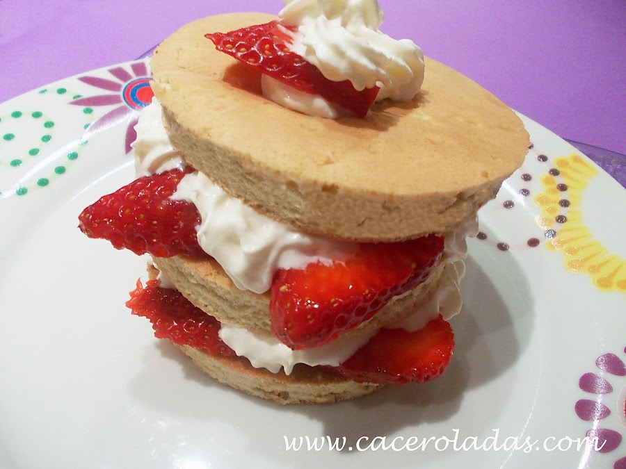 Colocamos una tortita de base, nata montada (crema de leche), y algunas fresas cortadas.... Lo he preparado de tres pisos, pero podréis hacerlo de más o menos altura.