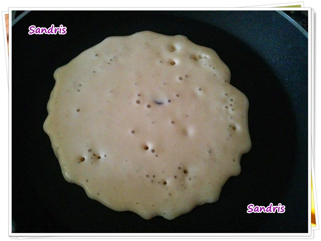Y bueno, es así de fácil. Mezclamos todos los ingredientes, los batimos bien para que no queden grumos y por último le agregamos las pepitas de chocolate. Tiene que quedar una salsa ni demasiado líquida, ni demasiado espesa. Y nada, cada uno tiene su forma de medir la cantidad para hacer las tortitas. Solo que a veces en mi caso, las hago unas veces más grandes y otras más pequeñas. Esta vez me apetecía hacerlas más pequeñas que grandes. Así que con un cucharón de estos soperos que usamos para servir la sopa... con medio tuve bastante para cada tortita. Cuando salgan burbujitas por arriba, sabemos que la tortita está lista para darle la vuelta. Es bastante rápido, no tiene que estar demasiado tiempo en la sarten. Igual en 2 minutos la tenemos hecha!!! Y las vamos amontonando unas encima de otras para que mantengan el calor.