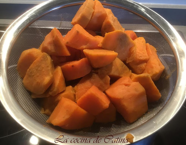 Pelamos los boniatos, los cortamos en trozos grandes y los ponemos a cocer cubiertos de agua hasta que estén blandos. Después los dejamos escurrir en un colador para que suelten bien el agua.