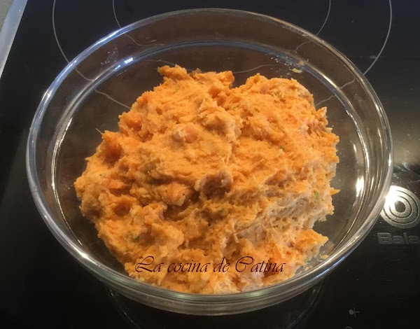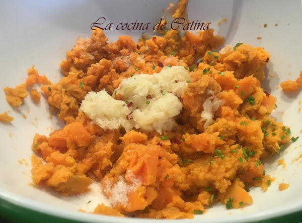En un bol grande colocamos los boniatos y añadimos el resto de los ingredientes. Mezclamos todo con las manos para que quede una masa uniforme.