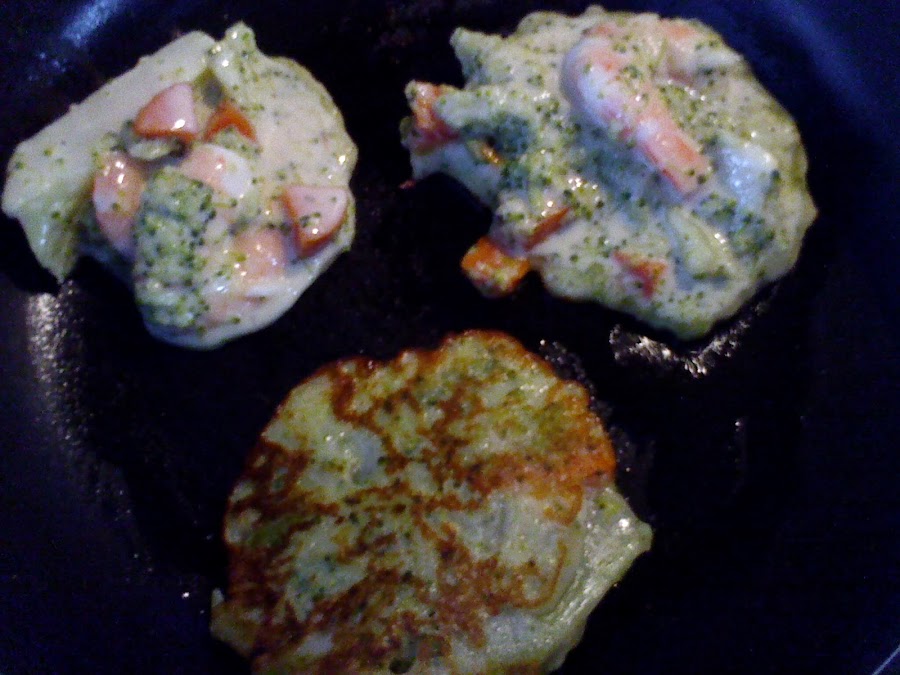 Engrasamos ligeramente una sartén y con la ayuda de un cazo vamos echando pequeñas cantidades de la mezcla que tenemos en el bol.