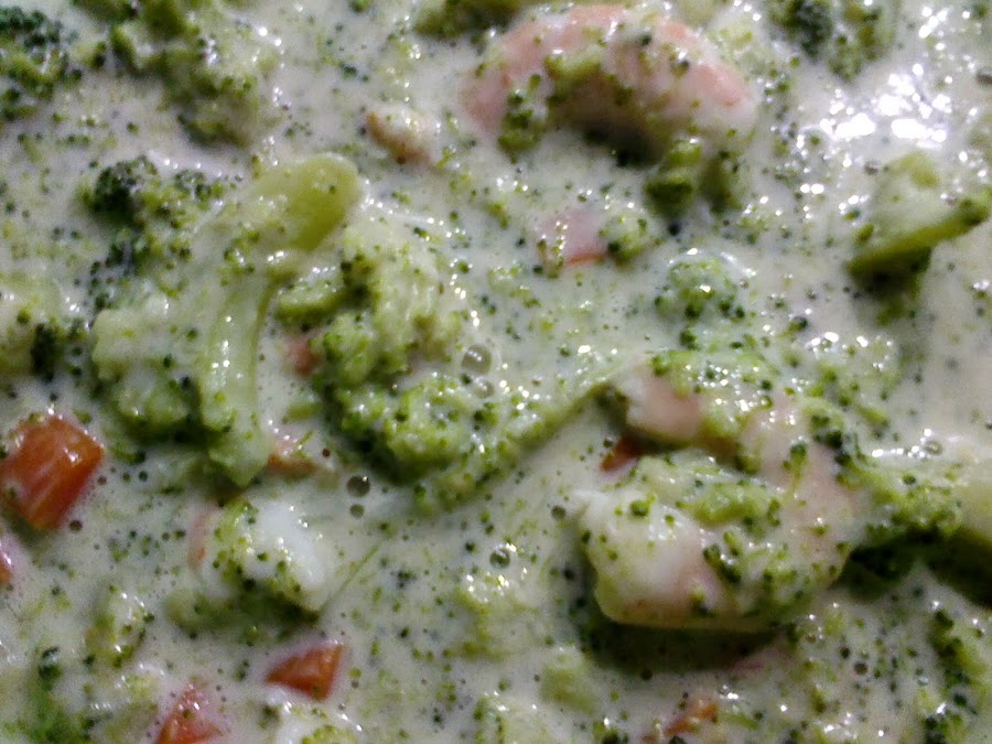 Cuando tenemos la masa trabajada, ligera y sin grumos añadimos el brócoli, la zanahoria, el puerro y los langostino y mezclamos bien.