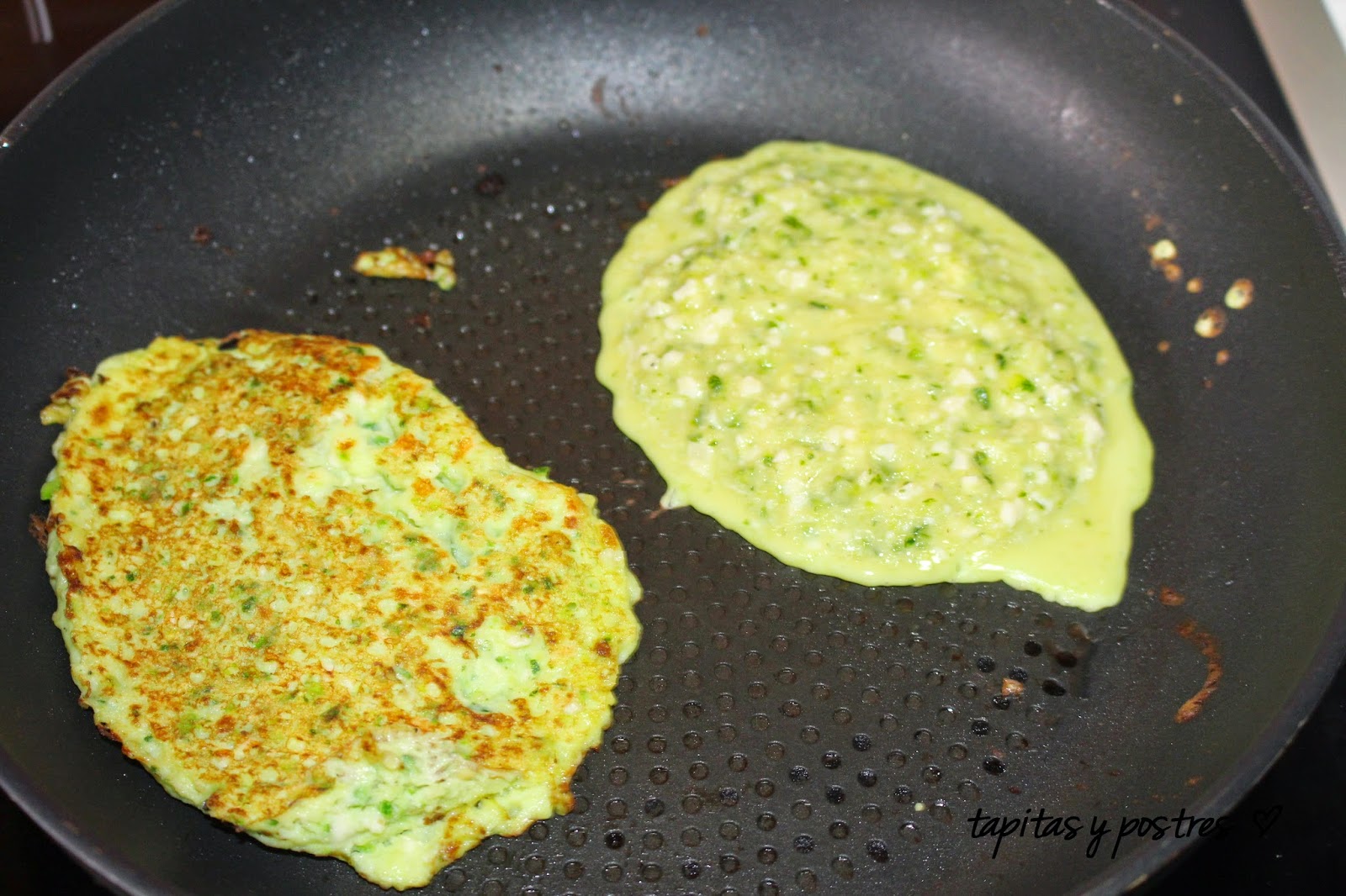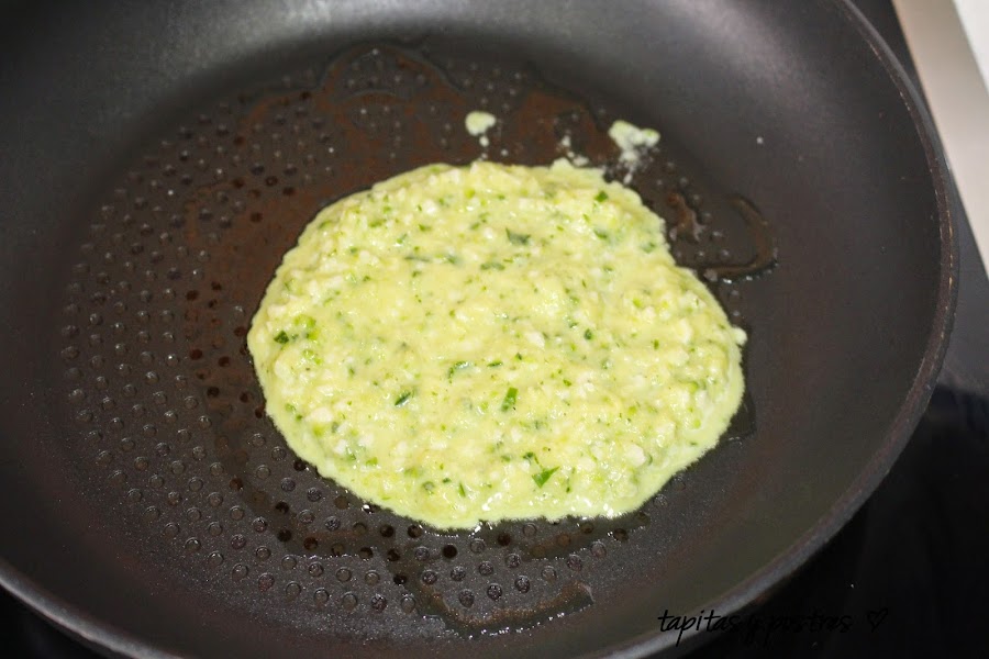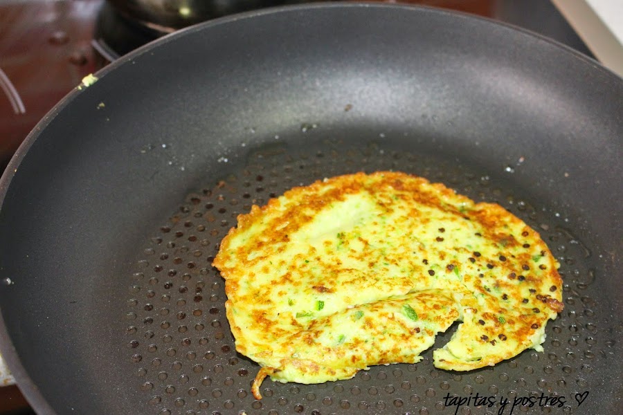 Ponemos una cucharadita de aceite en una sartén anti adherente y echamos una cucharada grande de la mezcla. Dejamos que se dore bien y damos la vuelta con una espátula, para que se dore por el otro lado.