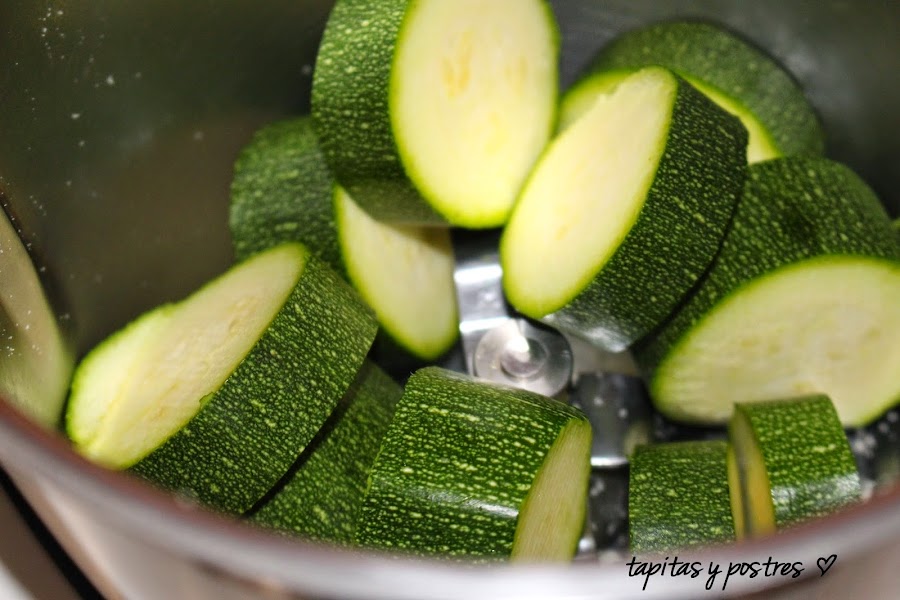 Lavamos y secamos el calabacín. Lo troceamos y lo trituramos en la thermomix o con una batidora.