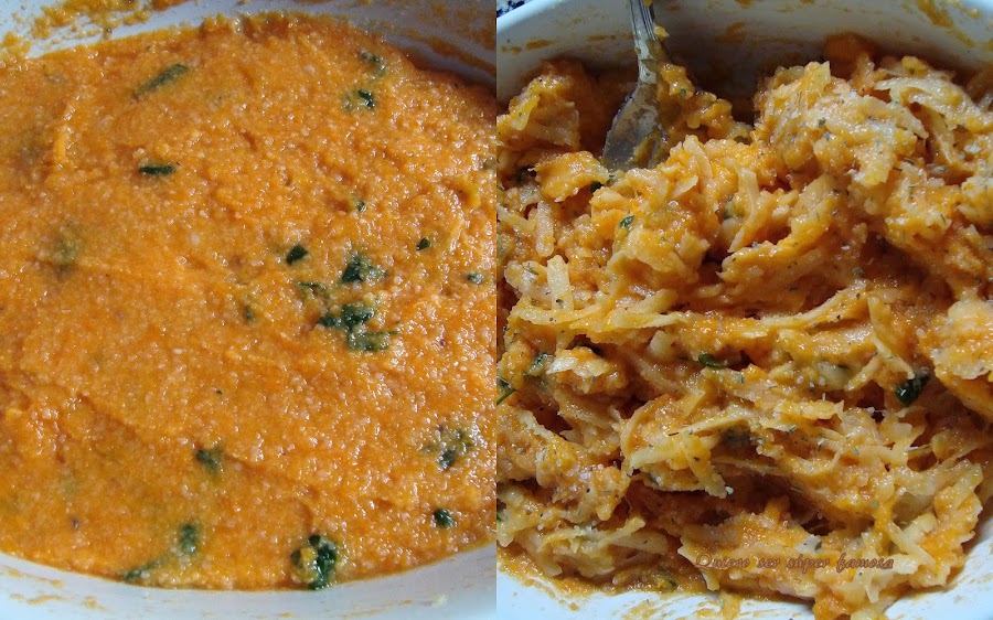 Añadir las patatas ralladas y escurridas a la calabaza que teníamos reservada y mezclar bien.