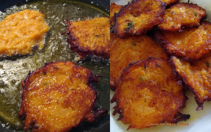 Igual que las de patata y cebolla (Kartoffeln-Puffer) quedan muy bien como guarnición de carne, o pescado, así como para una cena acompañadas de ensalada y embutidos...