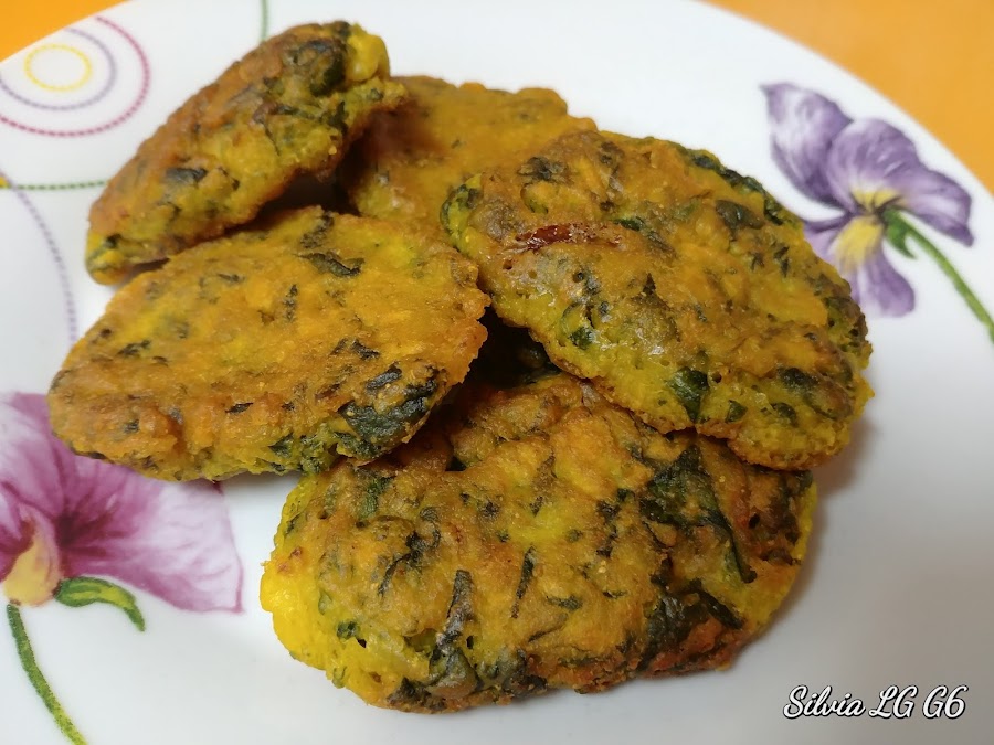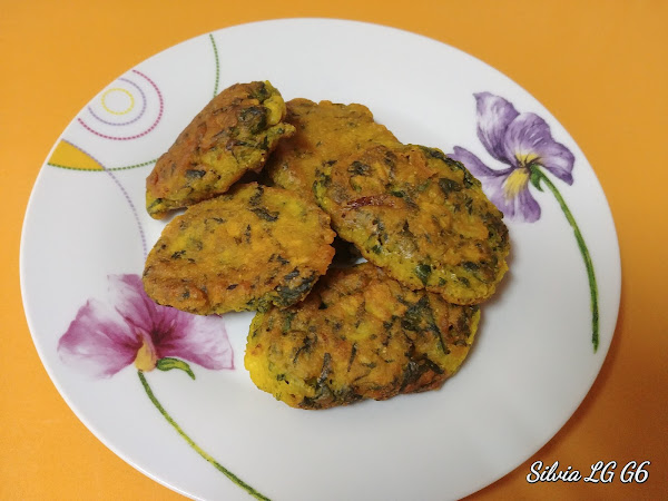 Se pican muy menuditos los ajos, la cebolla y las espinacas y se añaden los demás ingredientes: las harinas son al gusto, (un poco más de la de garbanzo) y se mezcla todo muy bien. Se sala al gusto y en una sartén amplia con aceite caliente, con ayuda de una cuchara sopera, se va echando la masa procurando hacer la forma de las tortitas y se fríe.