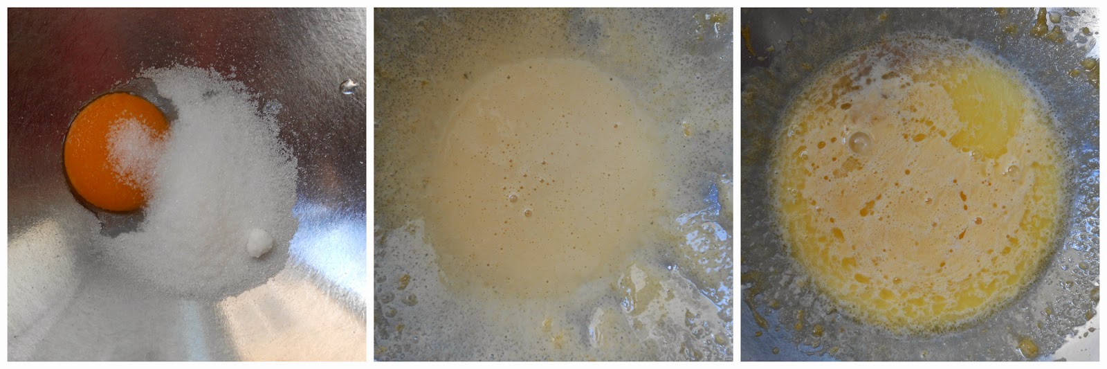 En un bol batir la yema con el azúcar. Añadir la leche, la mantequilla y la esencia de vainilla.