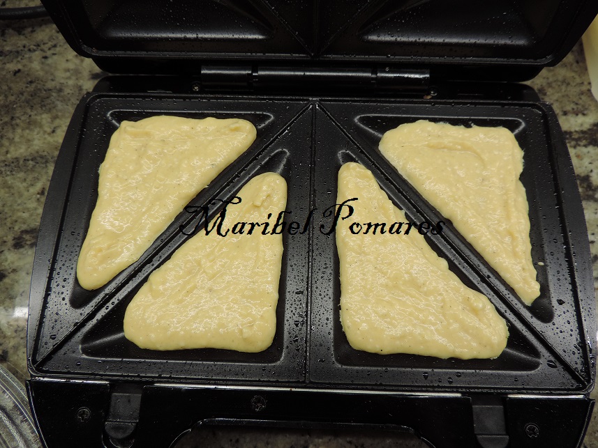 Untamos con mantequilla la sandwichera y ponemos una cucharada de la mezcla en cada hueco.