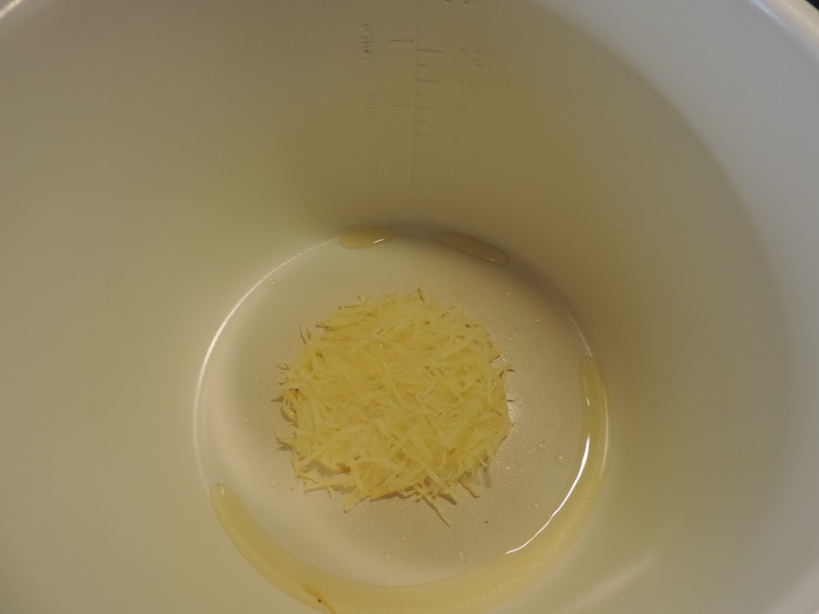 Poner unas gotas de aceite de oliva, echamos un poco de patata y aplastamos con una espátula.