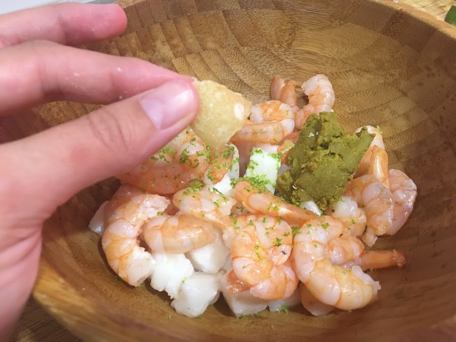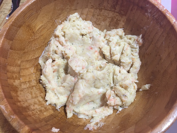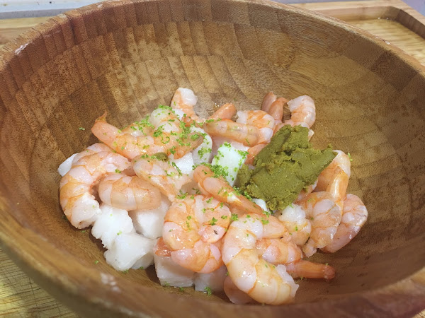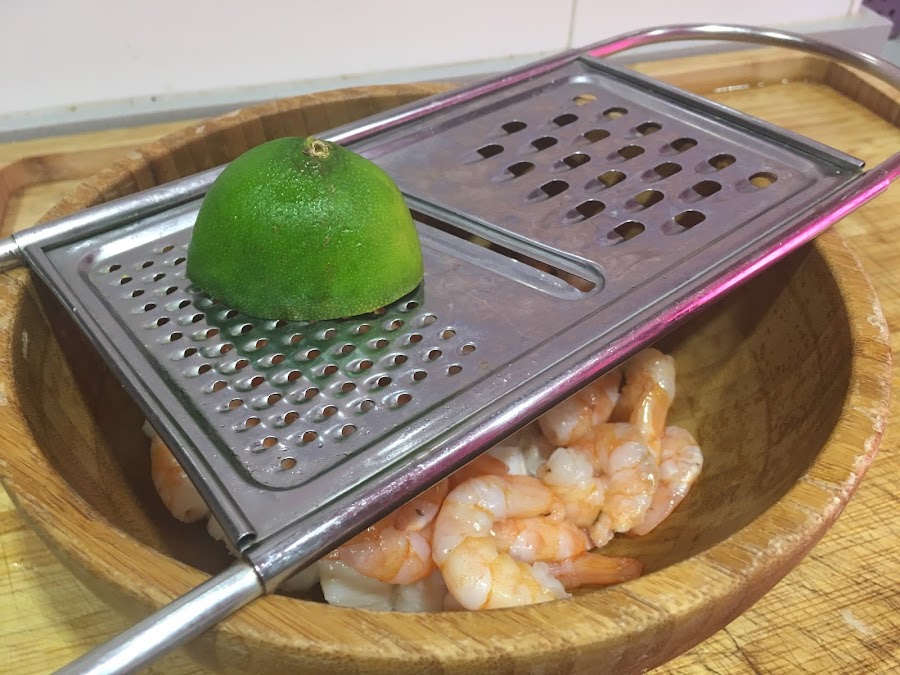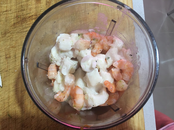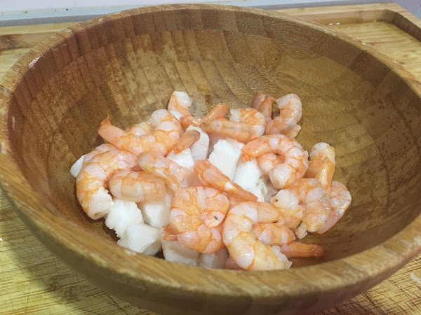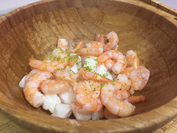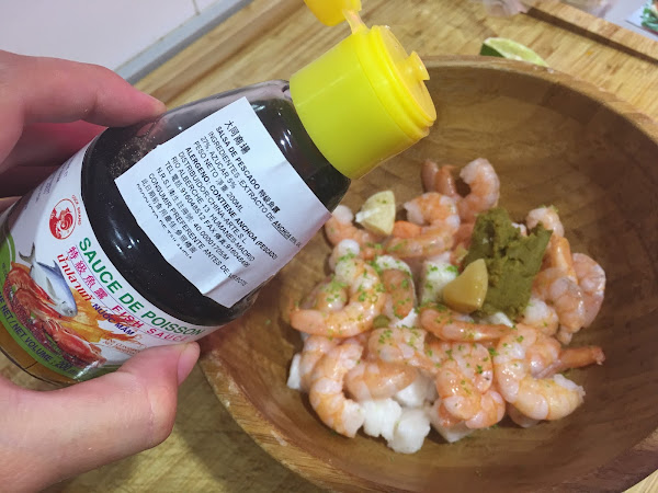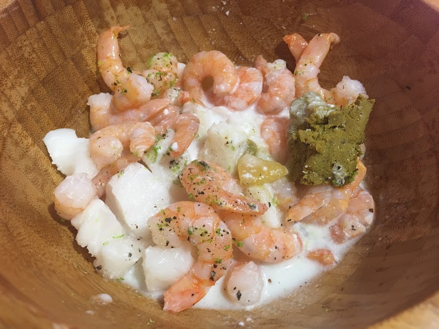1. Mezcla en un bol el pescado, las gambas, la pasta de curry, la leche de coco, la ralladura de lima, el cilantro, la salsa de pescado, el azúcar de palma, la sal y la pimienta.