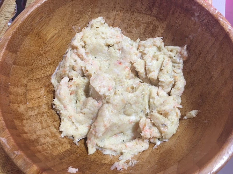 4. Divide la mezcla de pescado en 8 porciones y, con las manos forma una bola con cada una. Después aplánala dándole forma de pequeña hamburguesa. Reserva.