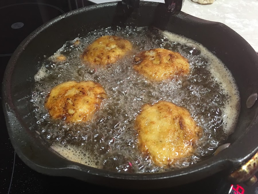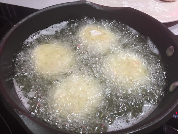 6. Calienta el aceite vegetal en una sartén amplia y fríe las tontitas de pescado por tandas, 2-3 minutos por cada lado hasta que tomen un color dorado.