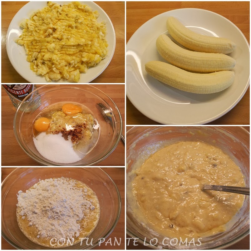 2. En un bol ponemos los plátanos chafados, los huevos enteros, el azúcar y la canela junto con el anís. Removemos con un tenedor o una espátula.