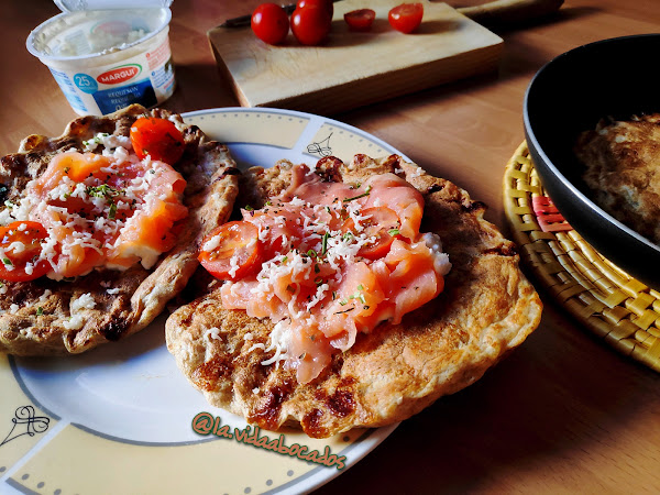 Cuando tengas las tortitas será la hora de añadirles los toppings. Yo he utilizado la otra media tarrina de queso cottage que habíamos reservado, unas lonchas de salmón, tomatitos cherry, un poquito de queso rallado y, para darle el toque verde, una pizca de albahaca y de cebollino picado.