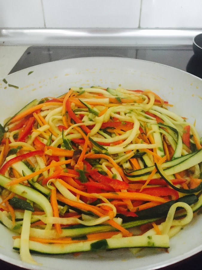 Una vez que tenes eso listo, le agregas las verduras que salteaste antes y lo revolves.
