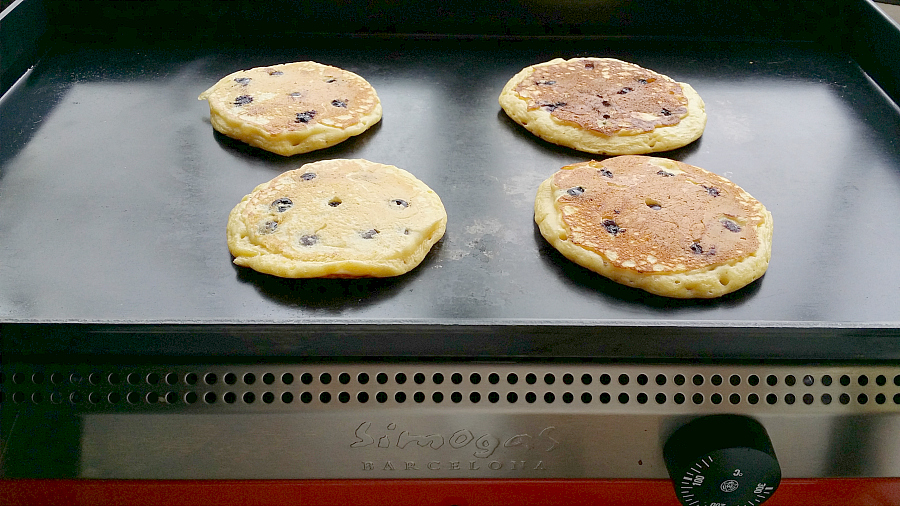 4. Calentar la plancha Simogas Rainbow Electric a unos 175ºC. Cuando esté caliente, derretir un trocito de mantequilla sobre la plancha. Ir poniendo porciones de masa con ayuda de un cucharón, formando círculos no demasiado grandes. Dejar que se cocine hasta que comiencen a aparecer burbujas en la parte superior; entonces, darle la vuelta a la tortita y dejar que se cocine 1-2 minutos por el otro lado.