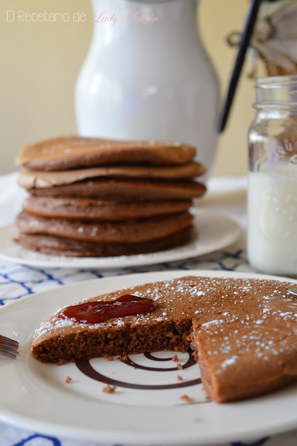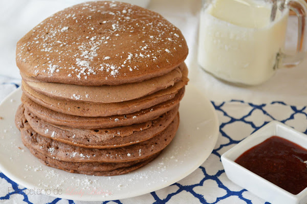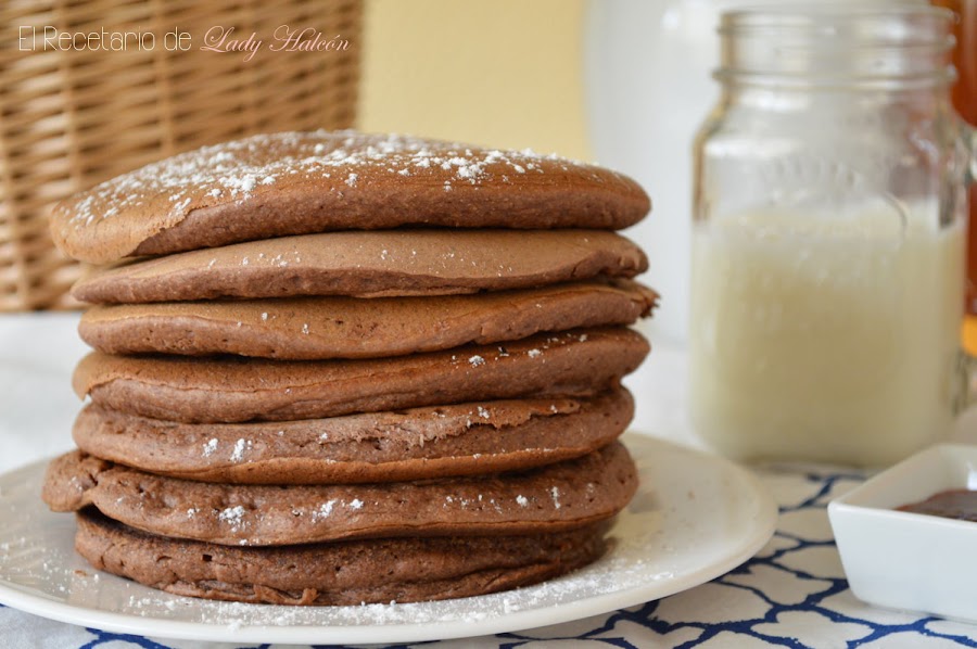Durante la semana me di unas cuantas vueltas por su cocina. En cada una de ellas seleccioné varios bundt cakes y bizcochos y los dejé guardados para el fin de semana. El sábado por la mañana antes de desayunar me dio por volver a entrar para ver cuál de ellos hacía y descubrí que había nuevas recetas... Me puse a leer los títulos y de repente vi ¡tortitas de chocolate!