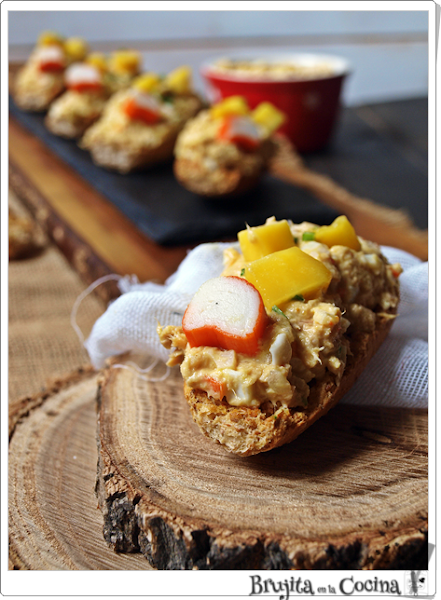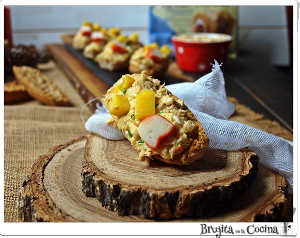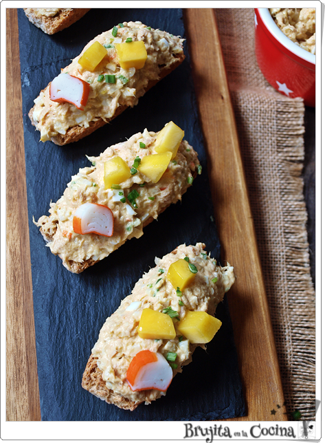 Para la presentación sobre cada panecillo untamos la crema de atún, y decoramos con un poco de cangrejo y mango, espolvoreamos cebollino picado y listo.