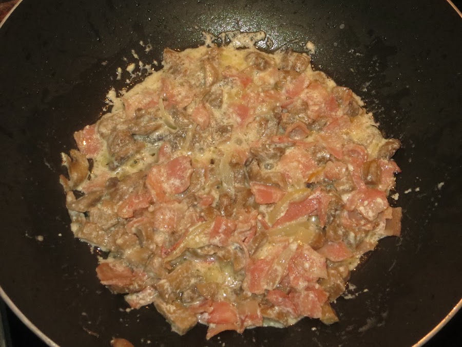 A continuación, cortamos el bacon en trocitos y lo añadimos también a la sartén cuando veamos que está dorado, añadimos la nata (crema de leche) y esperamos hasta que espese, probamos de sal y rectificamos. Lo colocamos encima de la tosta, la podéis tostar o no, en este caso no lo he hecho para saborear más el pan. Añadimos queso rallado por encima y ya está lista para comer.