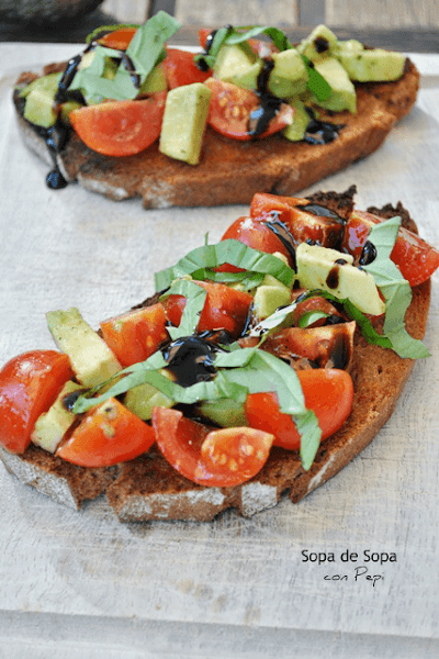 Para servir cubrir cada rebanada de pan con la mezcla de tomates y aguacate y repartir la albahaca por encima. Terminar regando los tomates con la reducción de balsámico. Servir enseguida.