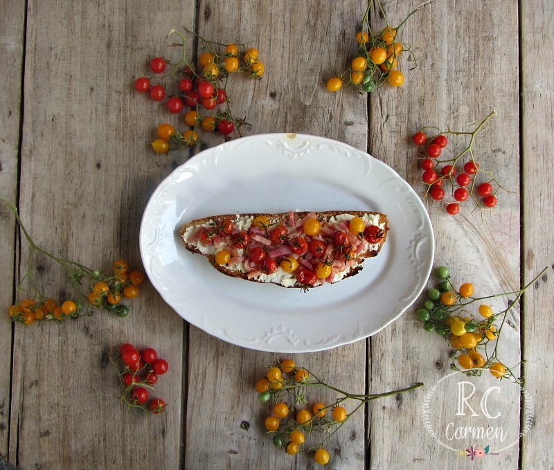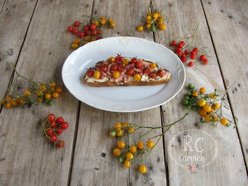 Encima del queso ponemos unas tiritas de bacon y por último tantos tomates cherry como nos apetezca.